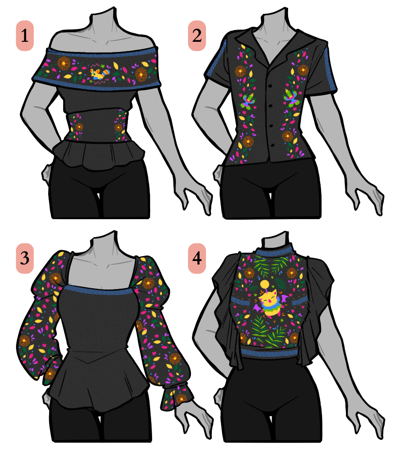 There are four styles of blouses and tunics; sizing is inclusive to all genders and body types so don't be afraid to ask! To highlight the colorful and intricate embroidery, all shirts come in either solid black or white fabric. Every piece is sewed and embroidered by her own hand. If they don't fit your style, Amare also has bandanas/kerchiefs with the same selection of patterns.